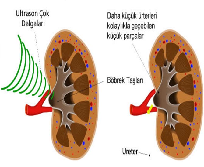 Ses dalgalarıyla böbrek taşı kırma (ESWL ), vücut dışından taşları kıran bir makine ile yapılır. Taşı kırmak için ses dalgaları odaklanarak hastanın cildinden taşa iletilir. Taşlar, ses dalgalarıyla küçük parçalara ayrılır. Kırılan parçacıklar idrar yoluyla atılır (Hasta taşları döker).Taş hastalarının %90’ından fazlası, ESWL yöntemi ile tedavi edilebilir. ESWL tamamen zararsız bir yöntem değildir. Bu nedenle taş kırma tavsiye ederken doğru hastaların seçimi önemlidir.